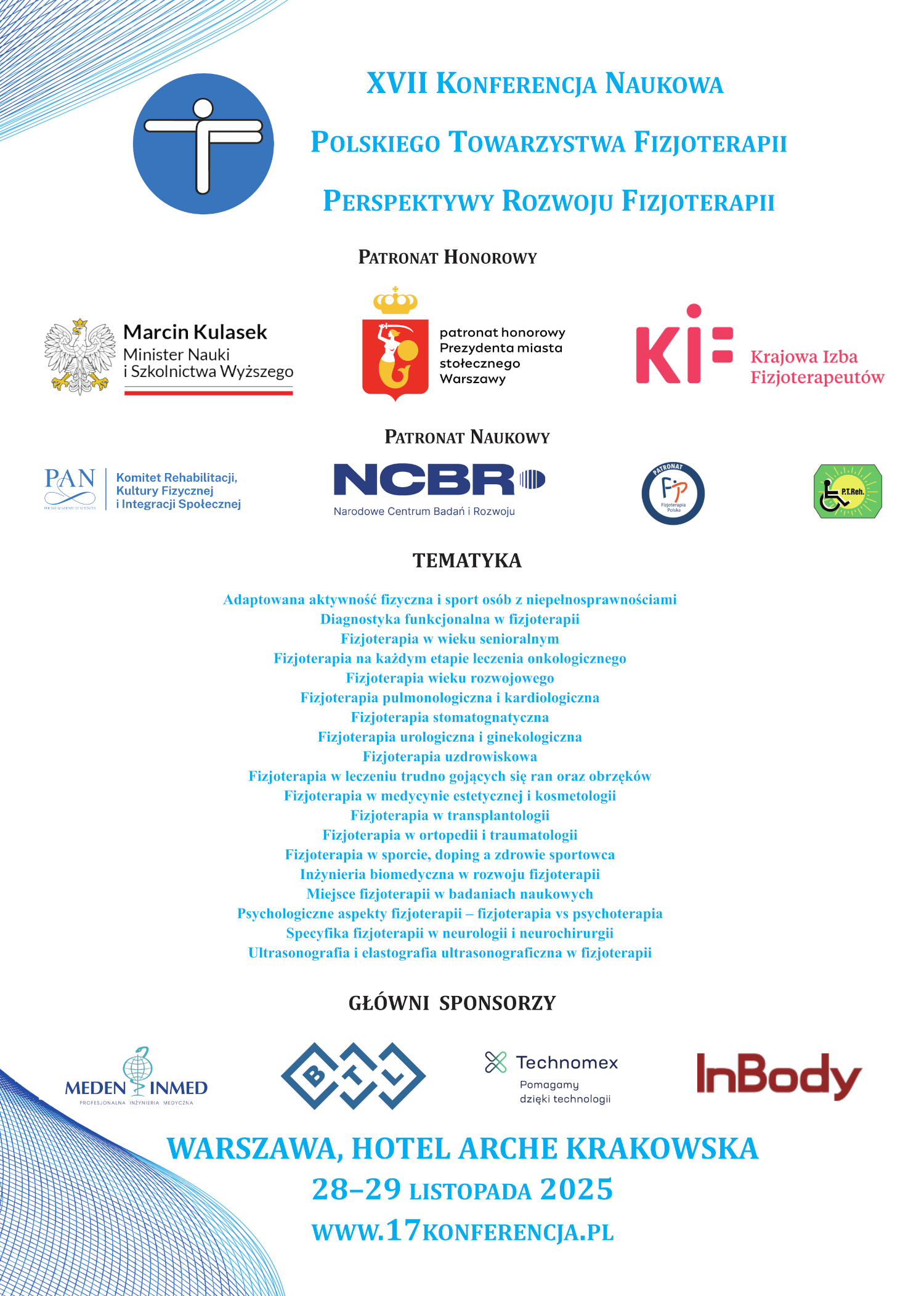 Polskie Towarzystwo Fizjoterapii zaprasza na wyjątkowe wydarzenie naukowe poświęcone przyszłości fizjoterapii w Polsce – 17. Konferencję PTF „Perspektywy rozwoju fizjoterapii”. Konferencja stanowi forum prezentacji najnowszych osiągnięć naukowych i praktycznych rozwiązań w zakresie fizjoterapii i rehabilitacji. Uczestnicy będą mieli okazję wysłuchać wykładów wybitnych ekspertów, wziąć udział w sesjach tematycznych i plakatowych, a także wymienić doświadczenia z liderami środowiska. Wydarzenie skierowane jest do fizjoterapeutów praktyków, pracowników naukowych, studentów oraz przedstawicieli pokrewnych dziedzin medycyny.