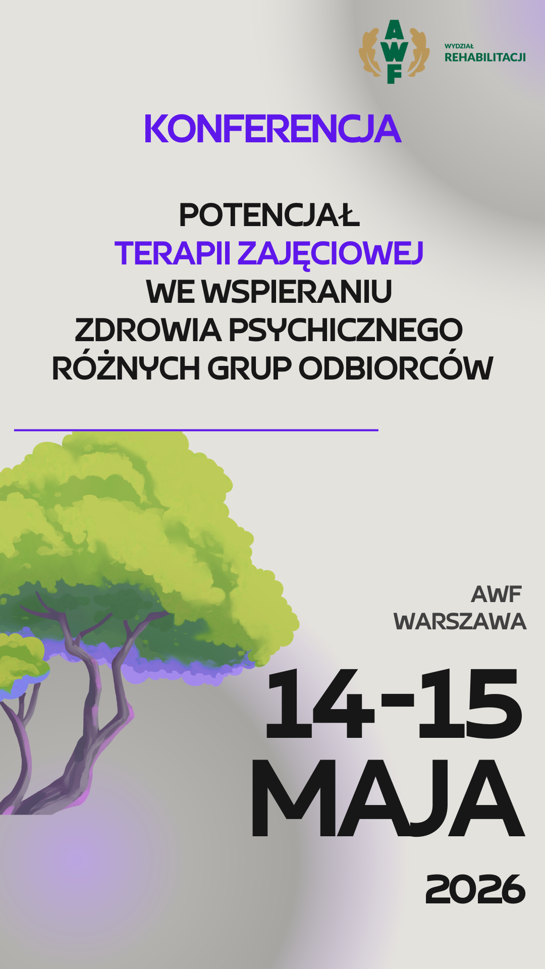 Wydarzenie organizowane przez Katedrę Terapii Zajęciowej AWF Warszawa. Konferencja stanowi przestrzeń do wymiany wiedzy, doświadczeń oraz pole do dyskusji na temat zdrowia psychicznego pacjentów, ich bliskich i terapeutów zajęciowych. Oprócz sesji plenarnych, plakatowych, odbędą się także praktyczne warsztaty dla uczestników.