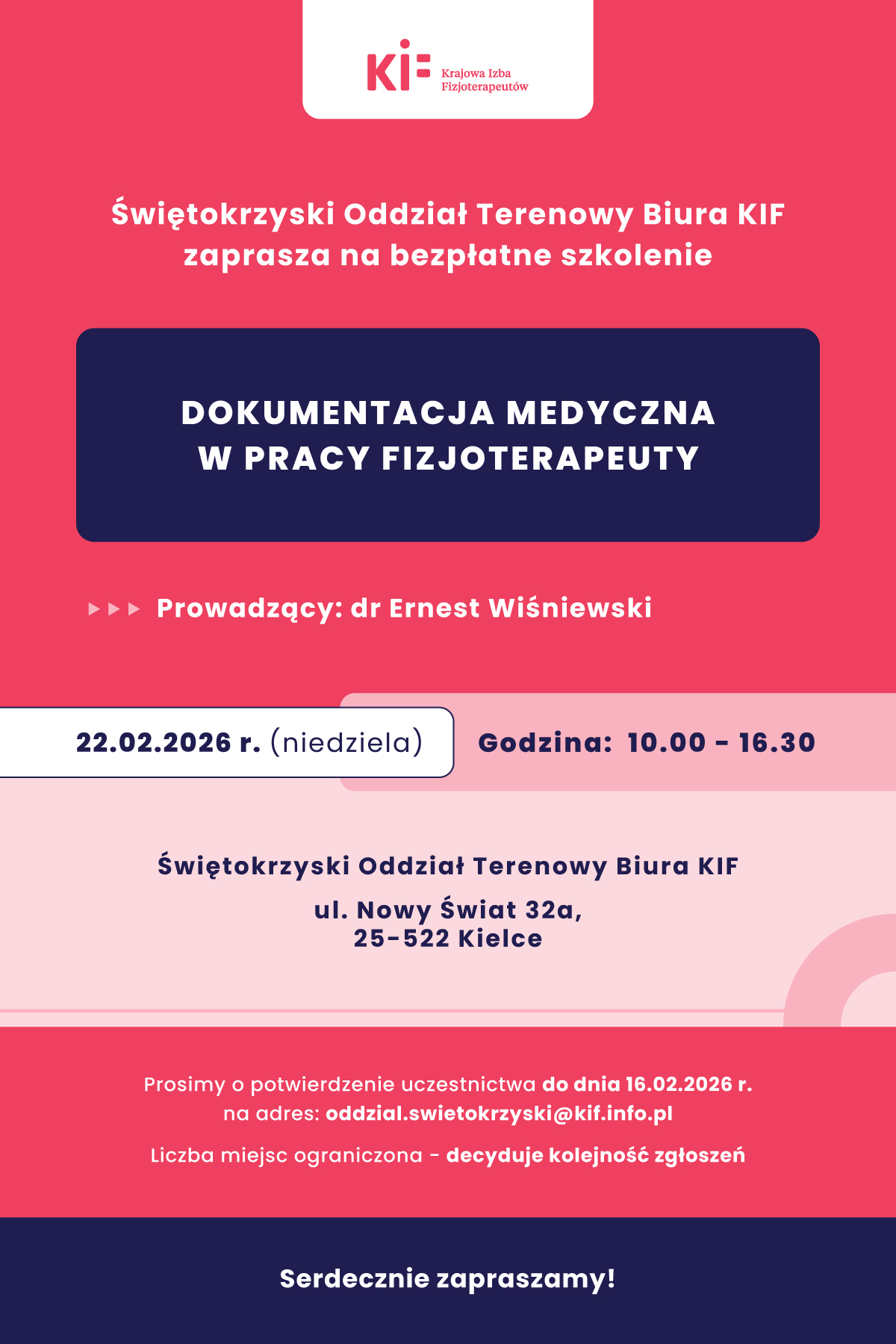 Świętokrzyski Oddział Terenowy Biura KIF zaprasza na bezpłatne szkolenie „Dokumentacja medyczna w pracy fizjoterapeuty”