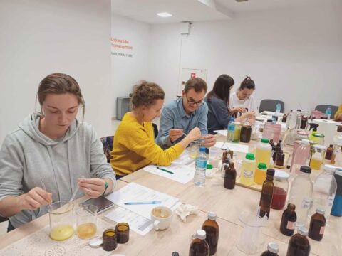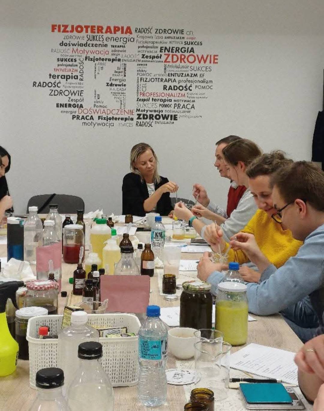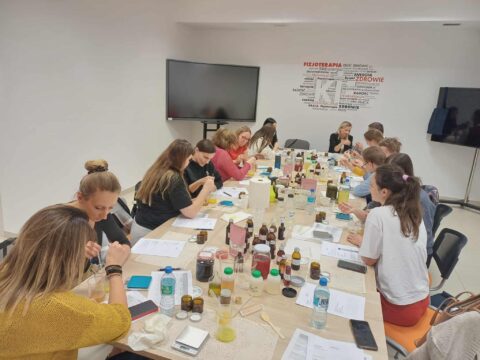 Warsztaty, które towarzyszyły obchodom, były doskonałą okazją do poszerzenia wiedzy i wymiany doświadczeń. Uczestnicy własnoręcznie przygotowywali kremy na bazie roślinnych składników, a także olejek z dziurawca i nostrzyka – naturalne preparaty, które z powodzeniem mogą być wykorzystywane w codziennej pracy fizjoterapeuty, szczególnie w masażu i pielęgnacji.