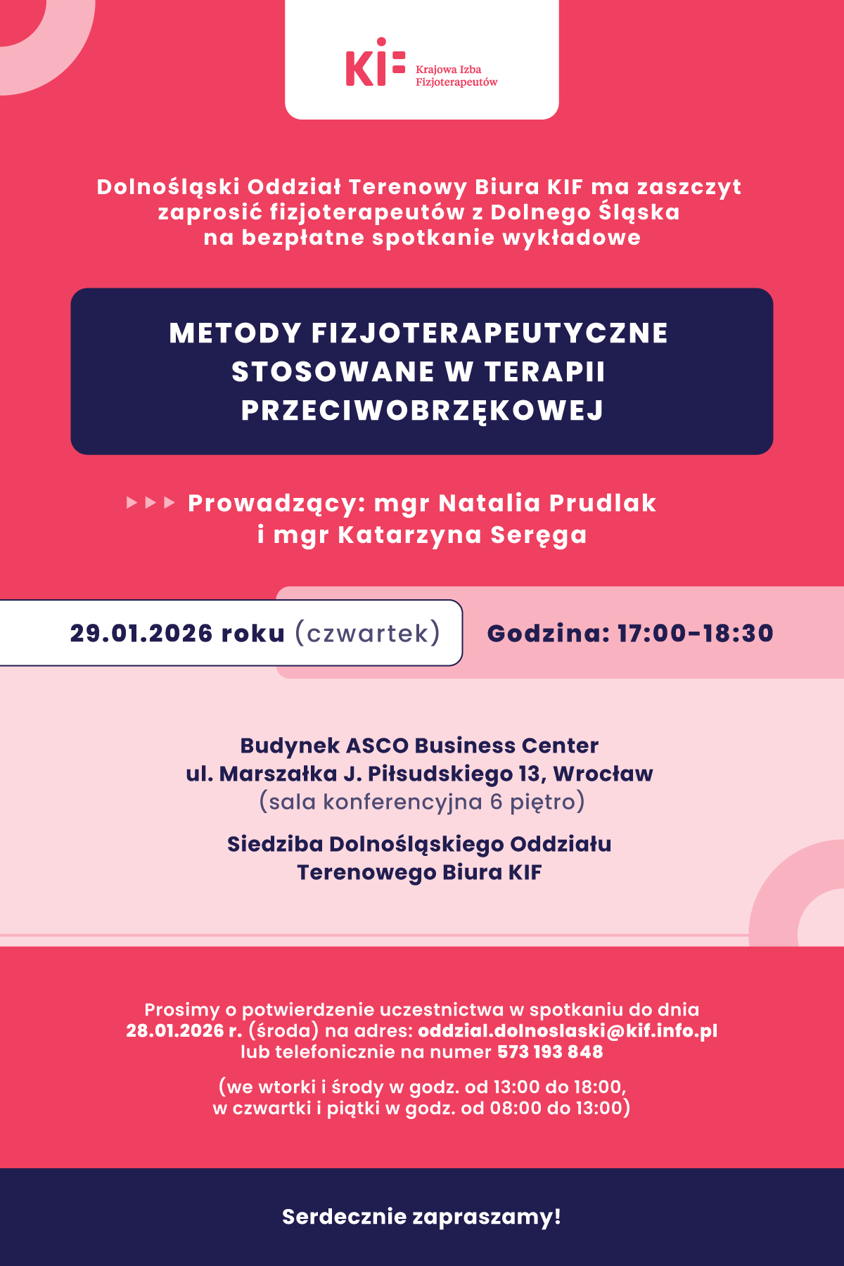 Dolnośląski Oddział Terenowy Biura KIF zaprasza na bezpłatny wykład “Metody fizjoterapeutyczne stosowane w terapii przeciwobrzękowej”.